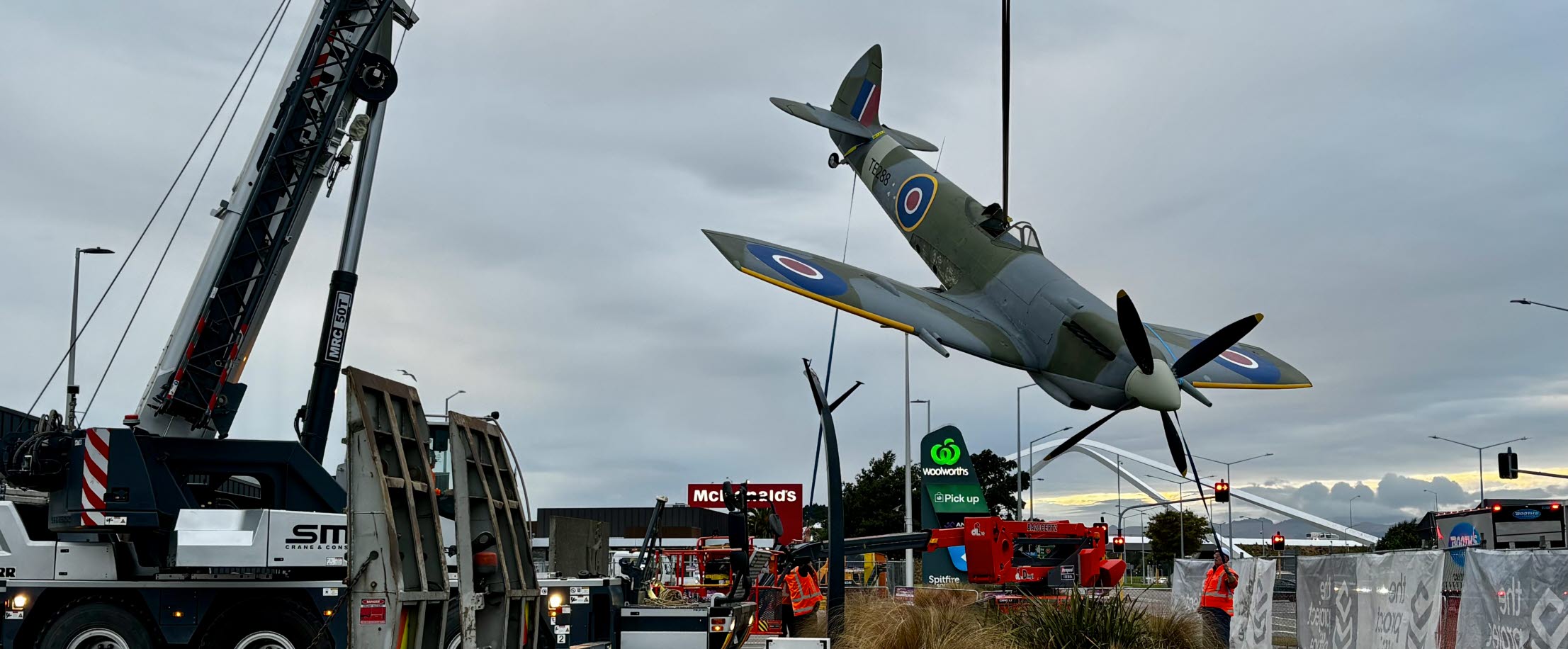 This morning the iconic Spitfire at Christchurch Airport’s Spitfire Square retail precinct was carefully removed for refurbishment.